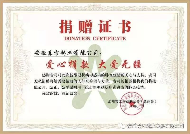 一方有难、八方支援。在公司支持下,长风融通参股企业安徽东方钙业有限公司日前也向所在地池州工商联捐赠10万元,舒城各家企业也向舒城县红十字会等疫情防控单位累计捐赠抗疫资金32万余元,用于当地新型冠状病毒疫情防控工作。